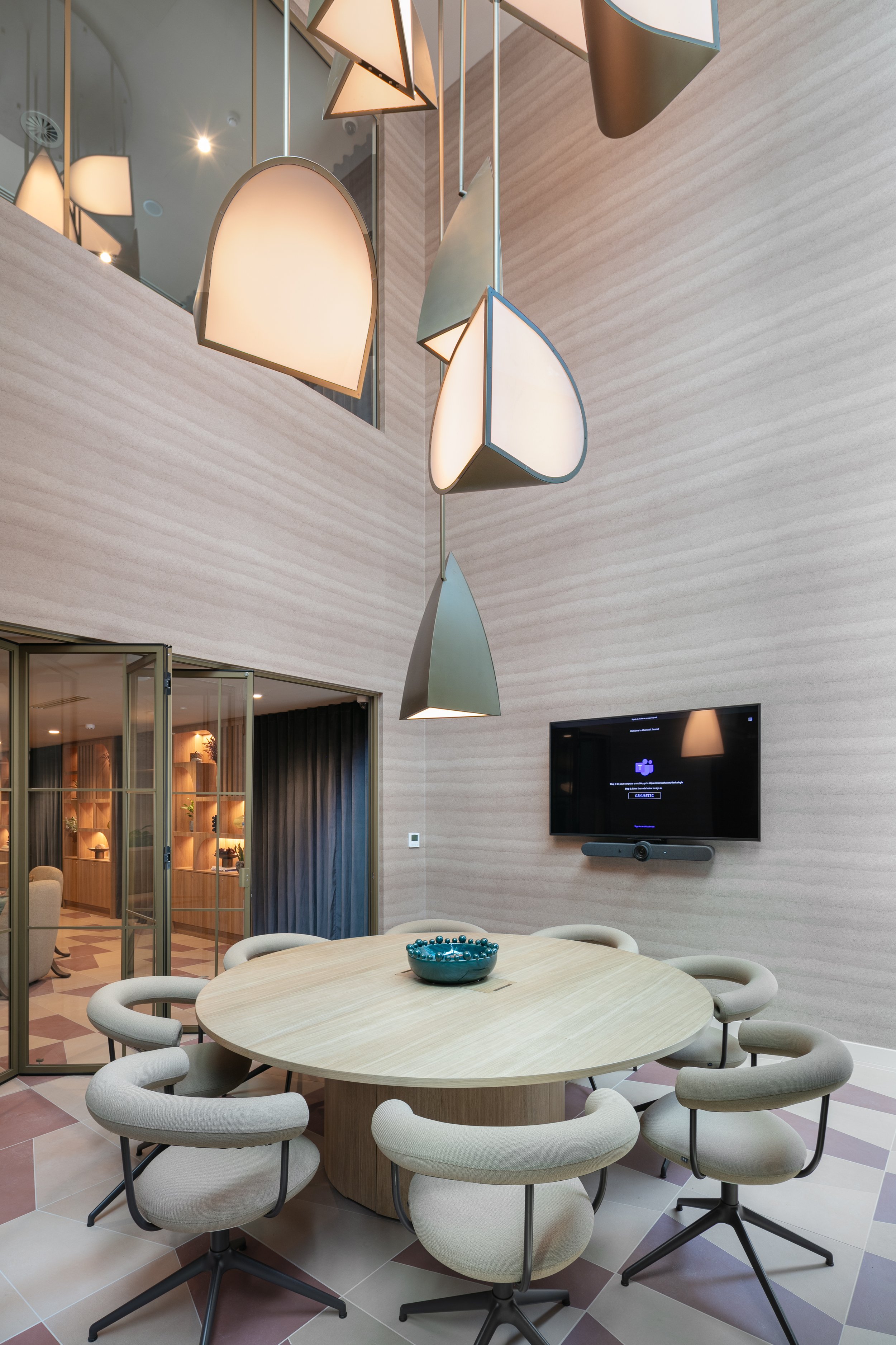 Building occupants can also make use of the west’s meeting room – an area primed for formal discussions and presentations. With views across Hardman Square, AXI stopped the mezzanine short of the glazed façade, creating a double height space within what is actually compact square footage. Rammed earth-effect wallpaper and a custom chandelier by Tyson Lighting, the space acts almost as a retailer’s window display, advertising an opulent new era for the 3 Hardman Street brand.